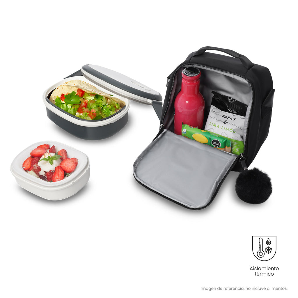 La lonchera Adelaide 2 es perfecta para llevar tus comidas de manera cómoda y segura. Este modelo compacto cuenta con tecnología térmica que preserva la temperatura por hasta 5 horas. Cuenta con forro interno RPET, elástico portabotella y un atractivo pompón en la cremallera. Con su correa ajustable y removible, se adapta a tu rutina diaria. ¡Hazla parte de tu día a día ahora!