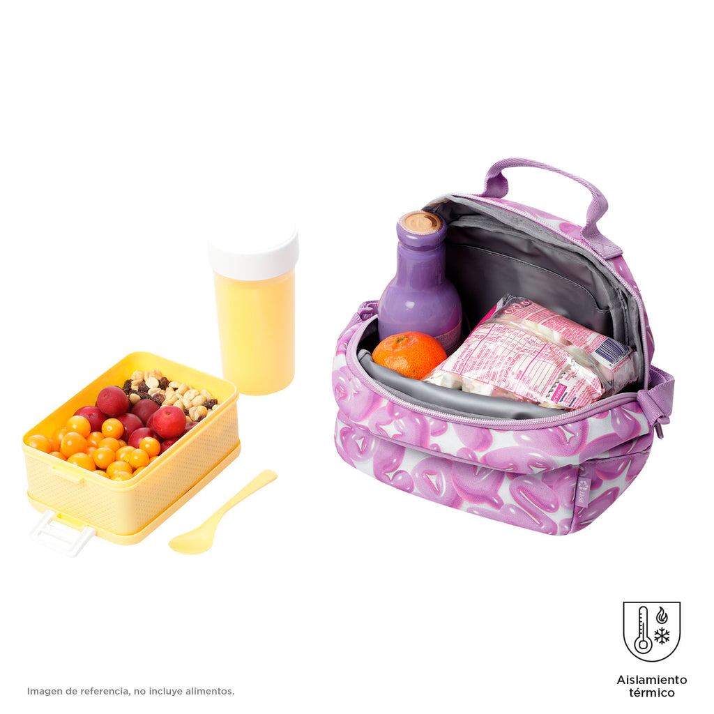 ¡Organiza tu día con la lonchera Borrador! Diseñada con aislamiento térmico para mantener tus alimentos frescos hasta por 5 horas, es repelente a líquidos y fácil de limpiar. Incluye un elástico interno para llevar botellas de forma segura. Además, cuenta con pasador para sistema de ruedas. Elaborada con poliéster y forro de etil vinil acetato, utiliza materiales reciclados, contribuyendo al cuidado del medio ambiente.