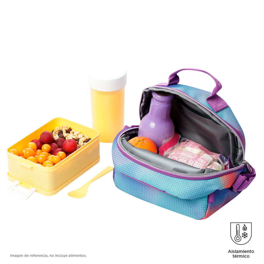 ¡Organiza tu día con la lonchera Borrador! Diseñada con aislamiento térmico para mantener tus alimentos frescos hasta por 5 horas, es repelente a líquidos y fácil de limpiar. Incluye un elástico interno para llevar botellas de forma segura. Además, cuenta con pasador para sistema de ruedas. Elaborada con poliéster y forro de etil vinil acetato, utiliza materiales reciclados, contribuyendo al cuidado del medio ambiente.