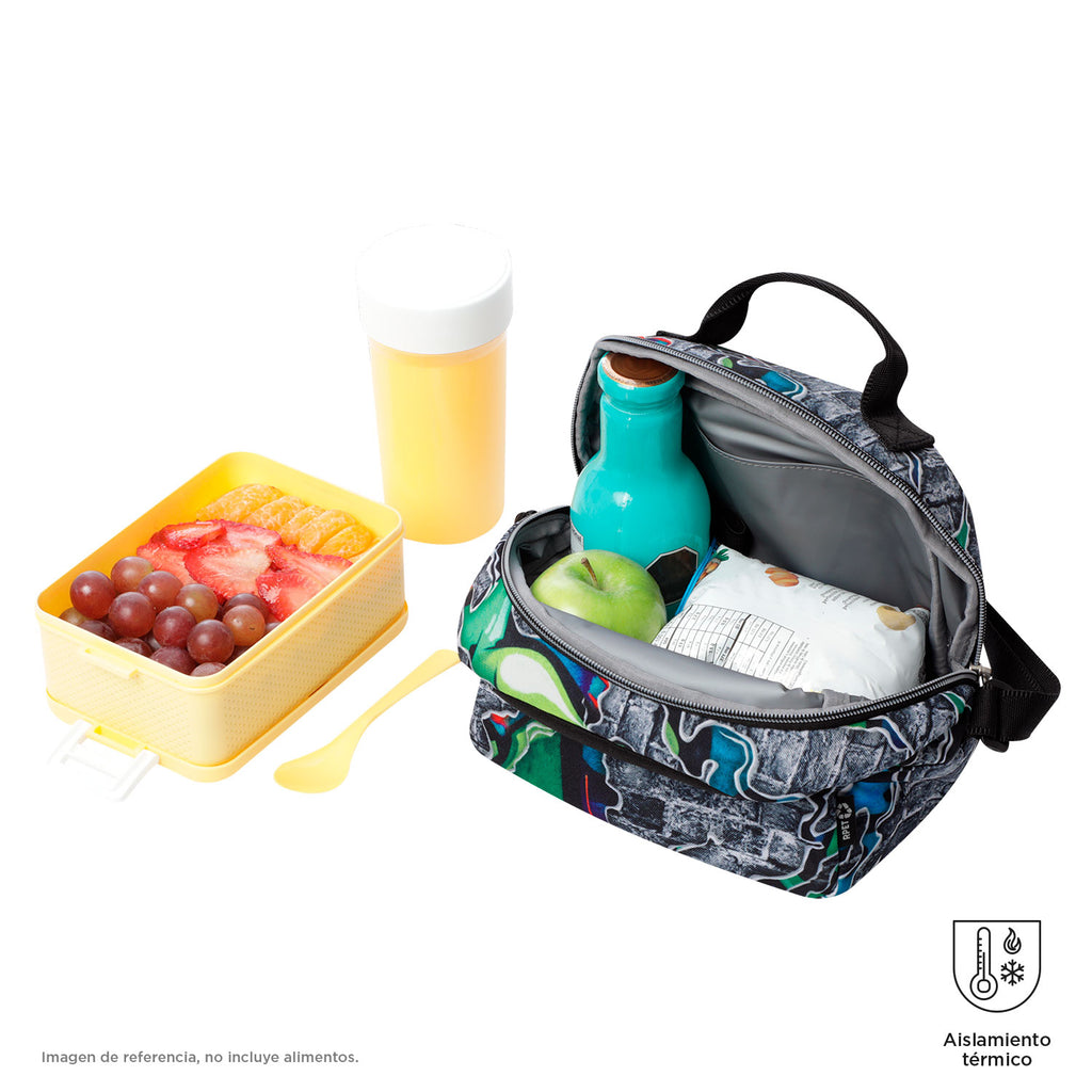 ¡Organiza tu día con la lonchera Borrador! Diseñada con aislamiento térmico para mantener tus alimentos frescos hasta por 5 horas, es repelente a líquidos y fácil de limpiar. Incluye un elástico interno para llevar botellas de forma segura. Además, cuenta con pasador para sistema de ruedas. Elaborada con poliéster y forro de etil vinil acetato, utiliza materiales reciclados, contribuyendo al cuidado del medio ambiente.