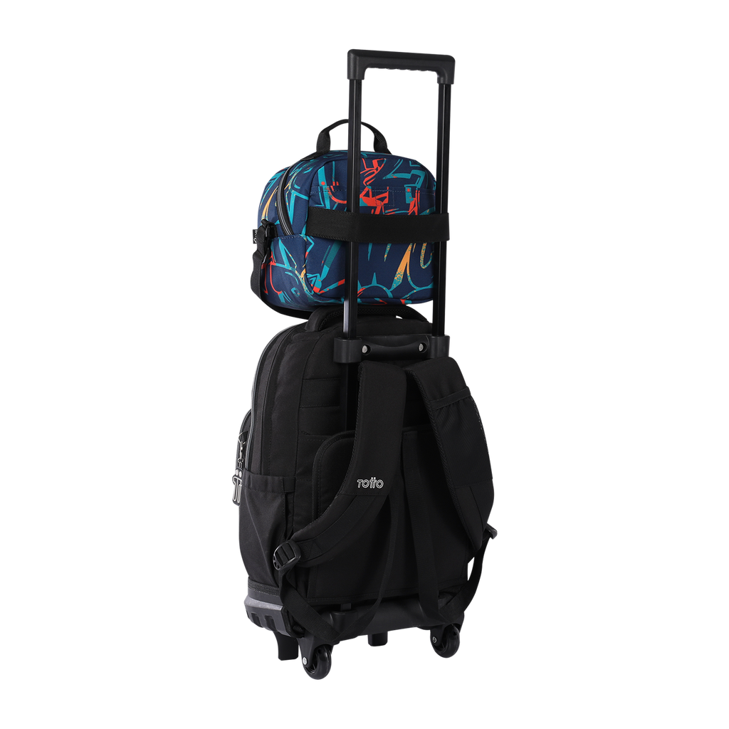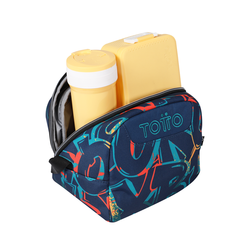 Lleva tus comidas frescas y sabrosas en esta lonchera escolar que tiene un compartimento principal con cierre en cremallera doble slider, dos elásticos internos para sujetar un botellón y accesorios plásticos. Fabricada en lona, con reata ajustable para llevar al hombro y una correa en la parte de atrás que permite adaptarla al sistema de los mochilas con ruedas. ¡Elige un diseño y combínalo como quieras!