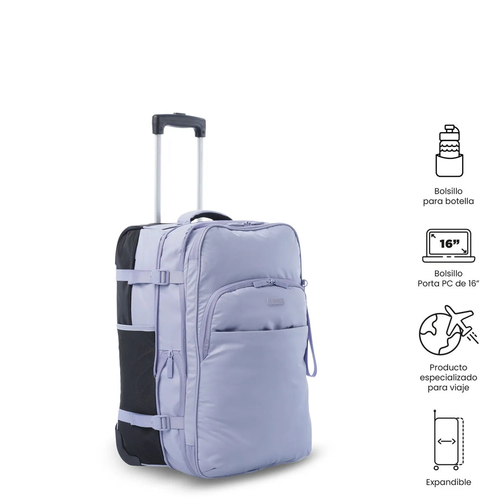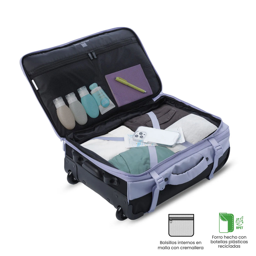 ¡Prepárate para tu próximo viaje con el equipaje Trip! Esta maleta de viaje es perfecta para cabina de avión o viajes terrestres. Con dos ruedas y soportes frontales, ofrece fácil manejo. Su compartimiento principal con expansión, correas de compresión, bolsillo porta PC de 16" y forro en material RPET brindan organización. Cuenta con cierre de cremallera con opción de asegurar con candado. Recuerda validar las medidas con tu aerolínea antes de viajar.