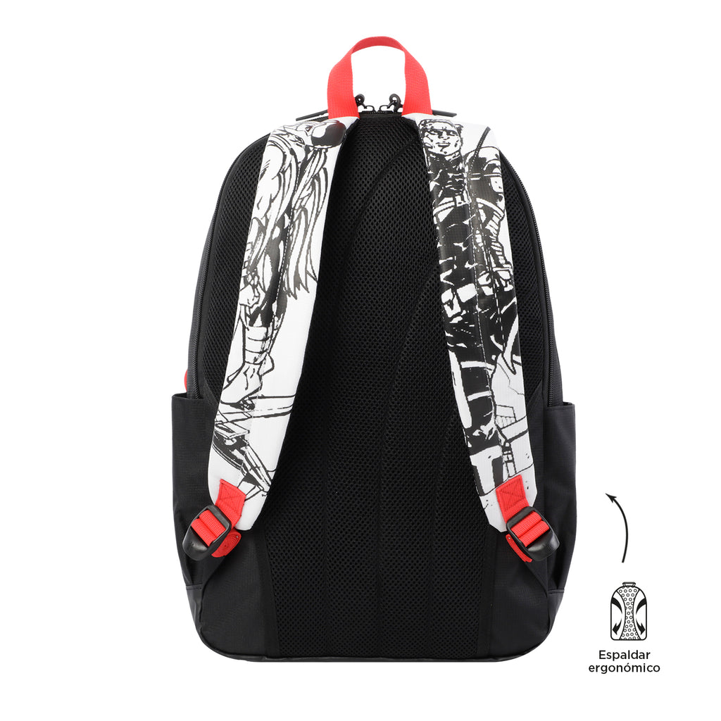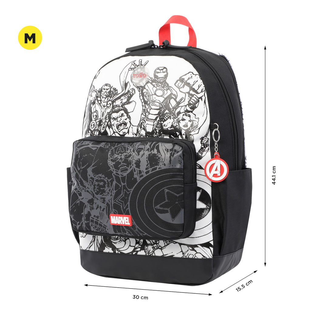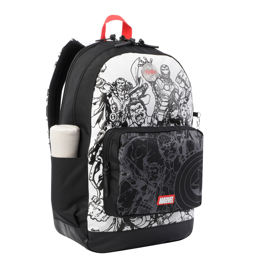 ¡Siente el poder del universo Marvel! El morral Avengers cuenta con un amplio compartimiento principal porta PC de 14", correas acolchadas ajustables a los hombros, manija superior en reata, bolsillos laterales porta botellas y bolsillo frontal con cierre en cremallera. Además, incluye llavero